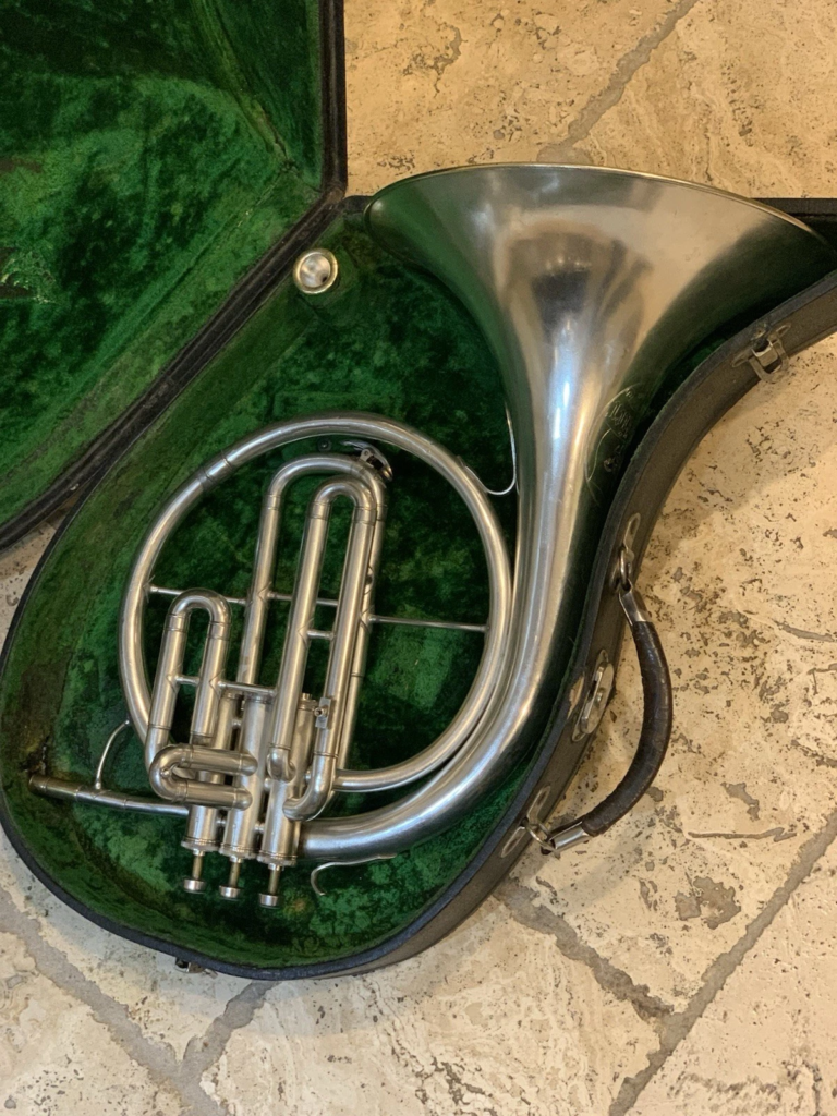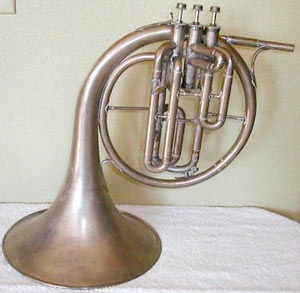 Instrumento antigo, reformado e com gravações apagadas na campana, mas com a ajuda de Brian Meyer e Ronald Lutterbie Jr. da comunidade Tenor Horn conseguimos indentificá-lo como um instrumento fabricado pela CG Conn Ltd nos anos 1930 graças aos detalhes das capas inferiores e superiores das válvulas e da construção das hastes de ligação e sustentação dos tubos/bombas. Provavelmente (?) um modelo Pan American Cavalier 96E.